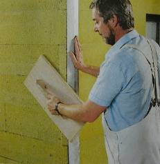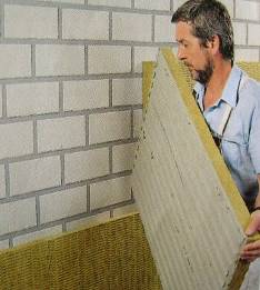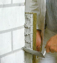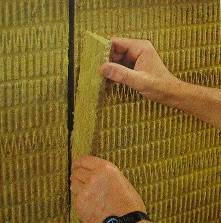 將涂抹好粘膠的第一排巖棉板按照正確位置擺放,然后將巖棉板緊密地粘貼在墻面上,注意防止巖棉板的下墜(采取用木條或支架的方式加以固定),巖棉板周?chē)鷶D出的粘膠必須立即刮掉,以保證粘貼下一塊巖棉板時(shí)板縫中不會(huì )嵌入粘膠。(圖3)